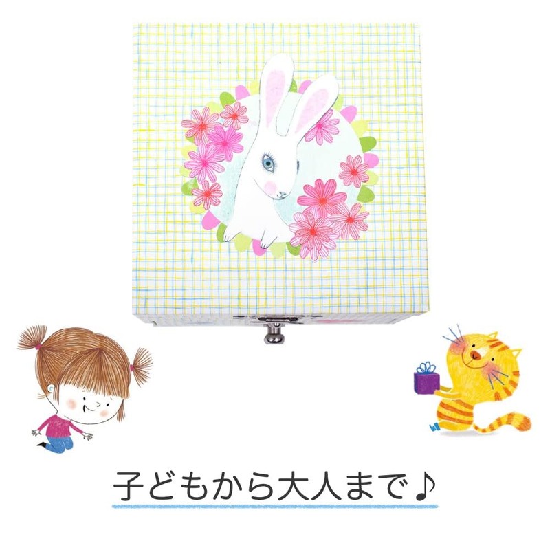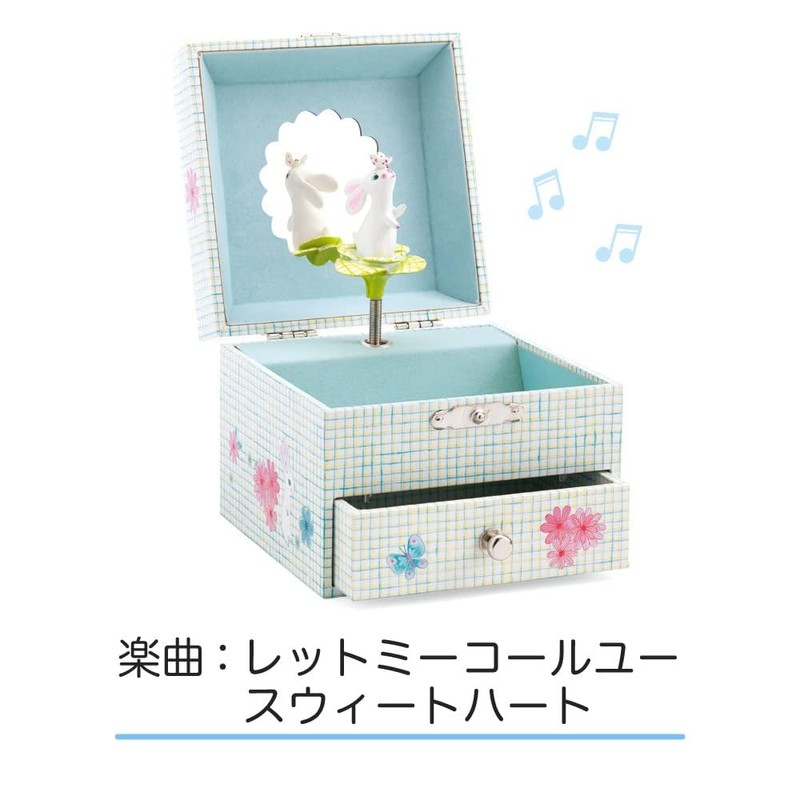 - ◆【オルゴール付き】【ジュエリーボックス】【フランス知育玩具ブランドDJECO】ヨーロッパで活躍するイラストレーターがデザインしたオルゴール付きのジュエリーボックス。ゼンマイを巻きフタを開けるとメロディーに合わせて可愛いウサギがクルクルと回り出します。中はネックレスやブレスレットなどをしまえる広いスペースや引き出しがあります。ぜひ大切なものをしまってください。
