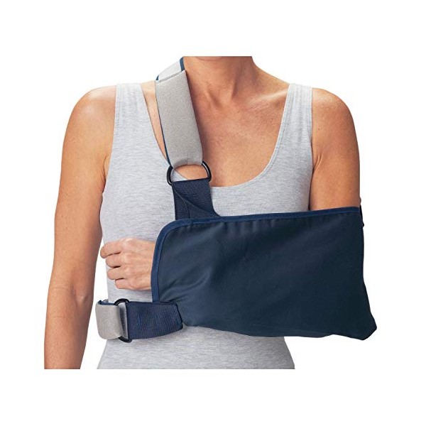 Sling is constructed with soft cotton/poly for patient comfort. Designed to exert upward pressure and immobilize arm and shoulder. Waist and shoulder straps are a plush foam laminate with contact closure. Fits right or left arm. Ideal for immobilization and support of the shoulder and elbow joints.