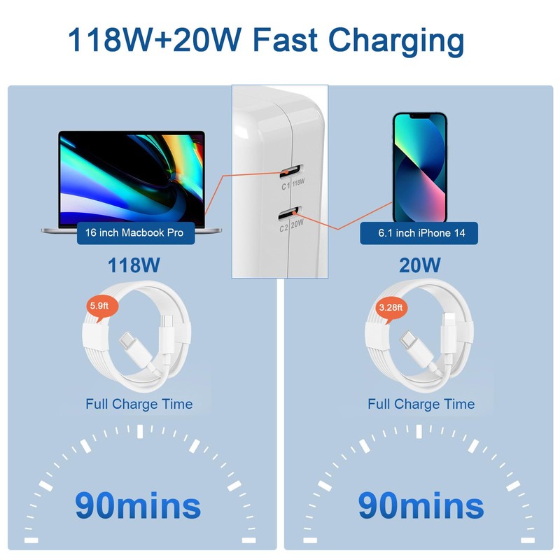 - 1. Super fast charging: With a high charging efficiency of up to 96%, the 118W USB C Macbook charger can fully charge most laptops in about 1 hour and 30 minutes, and mobile phones from 0% to 80% in just 20 minutes.