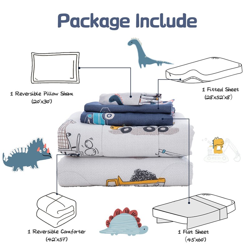 Included Components:Pillow Sham, Fitted Sheet, Toddler Comforter, Flat Sheet