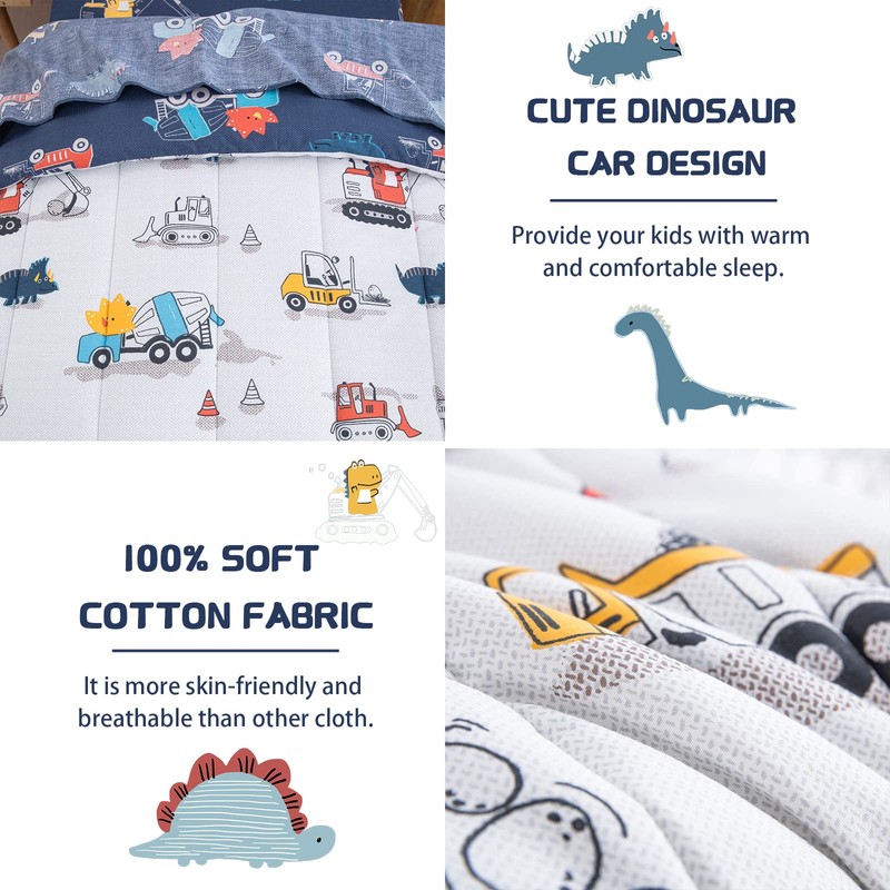 DJY 4 Pieces Cotton Toddler Bedding Set, Dinosaur Cars Reversible Toddler Bed Comforter Set for Kids Boys Girls, Includes Quilted Comforter, Flat Sheet, Fitted Sheet and Pillowcase