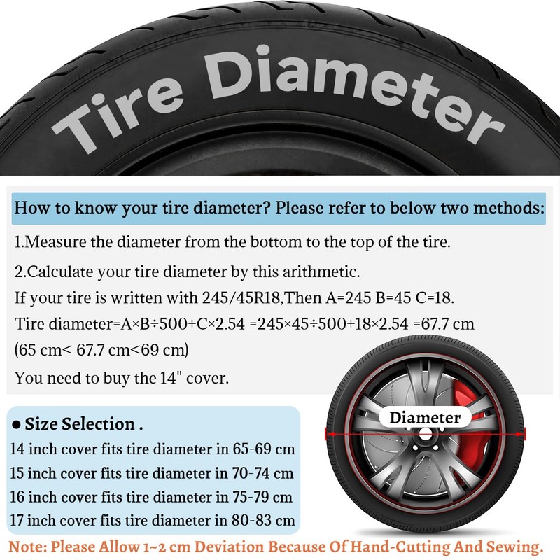 - Universal Fit: Available in 14", 15", 16", 17" sizes, compatible with cars, trucks, s, SUVs, RVs, trailers, and campers. The diameter of the camera hole of each tire covers is 10cm. Before purchasing, please measure the size of your tire.