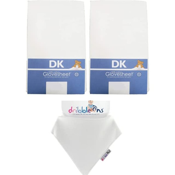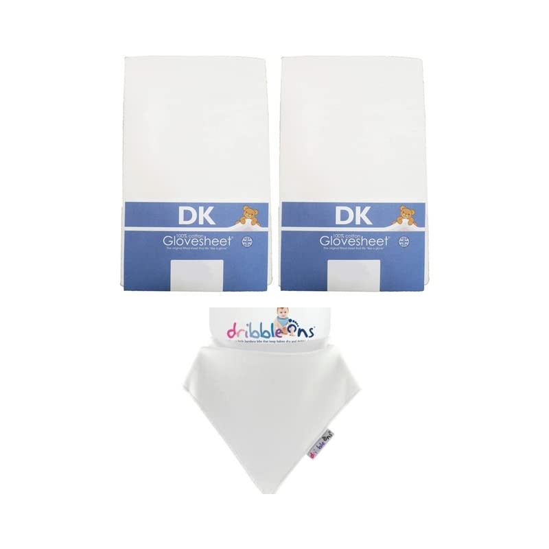 DK Glovesheets Two White Cotton Fitted Crib Sheets - Specifically Designed to Be Compatible With The Next to Me Mattress Plus 1 x White Dribble Ons Bandana Bib Package
