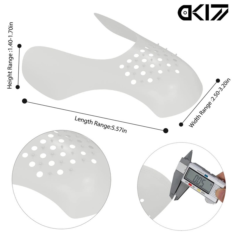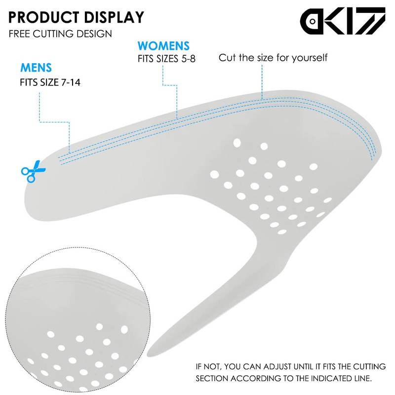 - Easy to ues and adjustable -- Compatible with most shoes. Easily pop crease protectors in and keep shoe sheilds in while wearing your shoes. Made with the perfect dimensions and crease guards are also adjustable. With auxiliary cutting lines, the size of sneaker crease protector can be trimmed