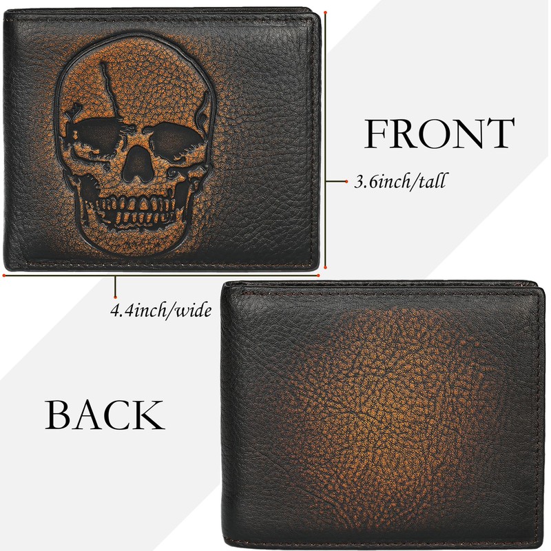 DK86 Skull Bifold Wallet for Men RFID Blocking Full Grain Leather With Hand Burnished Extra Capacity Multiple Card Slots with 2 ID Windows