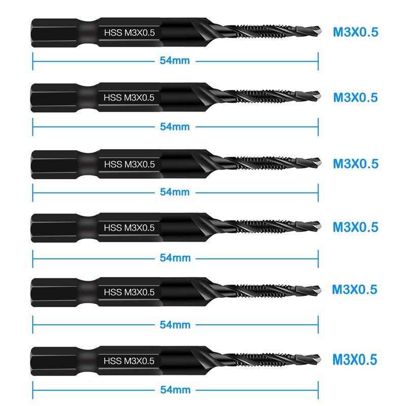 - HIGH VERSATILITY – Set of 6 drill tap bits in sizes M3*0.5, with 1/4" hex quick-change shank, fit Electric hand drill, impact drill, bench drill, electric screwdriver and other tap machines