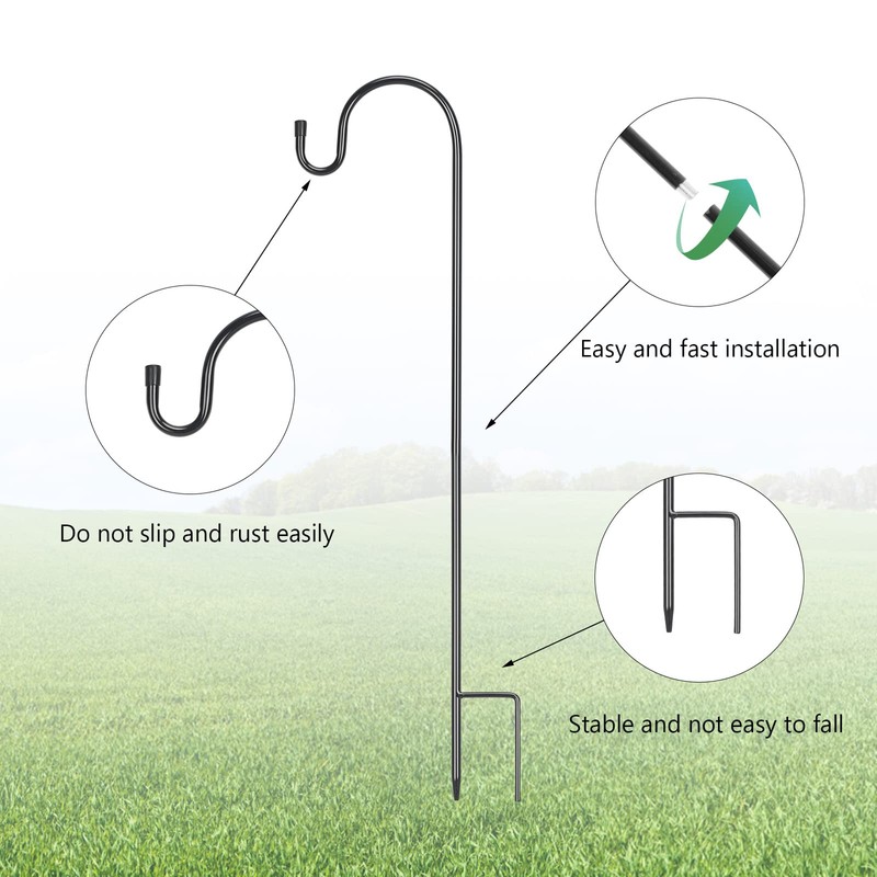 • Foot design: the bottom of the garden shepherd hook is a sharp tip design with feet for reinforcement, extra long base prongs maintain a firm, upright posture while remaining firmly planted in the ground; you don't need to worry about the strong wind.