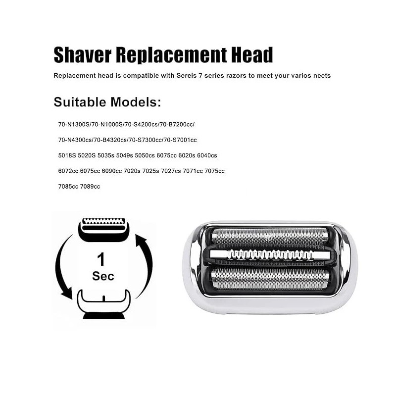 This high-quality 73S Replacement Foil Head is compatible with Braun Series 7 electric shavers, ensuring superior shaving performance. The foil head is silver in color, comes in a secure blister packaging, and includes the complete foil and blade head for easy installation.