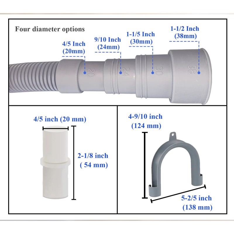 - 【Complete 7-Piece Kit】 Includes: 1x 10ft PP drain hose, 1x U-bracket, 4x adjustable clamps & 1x adapter.