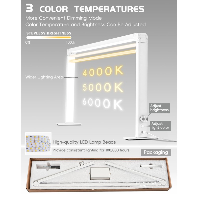 - 【 More Convenient Dimming Mode 】 Two switches on one side of the lamp is used for adjusting the brightness and color temperature respectively. The brightness can be adjusted using a stepless dimming mode, ranging from 0% to maximum 100%. Three color temperatures can be switched among, namely warm light (3000K), neutral light (4000K), and white light (6000K).