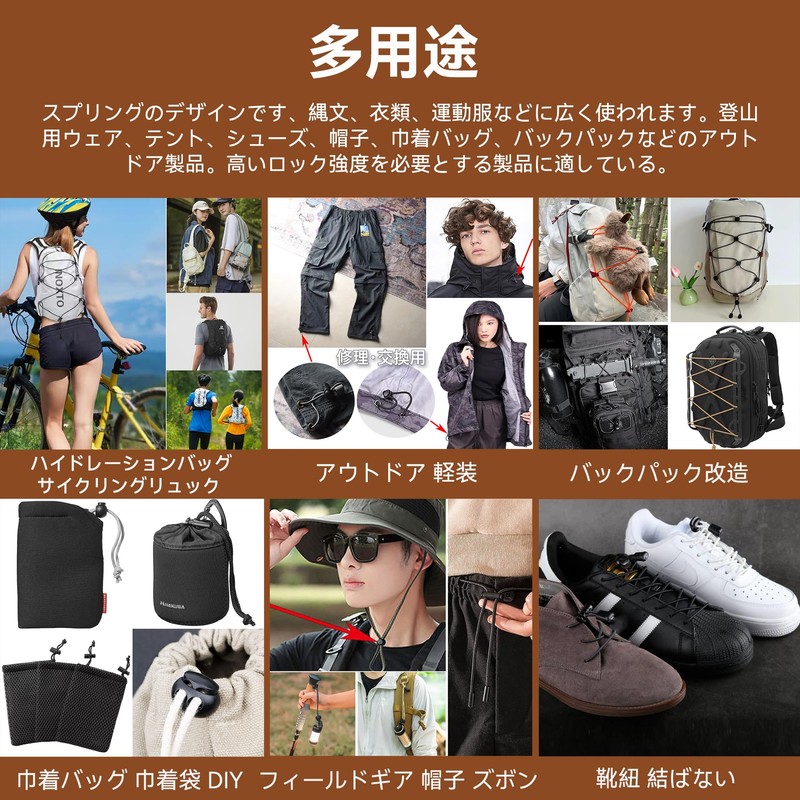 - Versatile: The spring design is widely used for rope ropes, clothing, athletic clothing, etc. Outdoor products such as climbing wear, tents, shoes, hats, drawstring bags, backpacks and so on. Suitable for products that require high locking strength