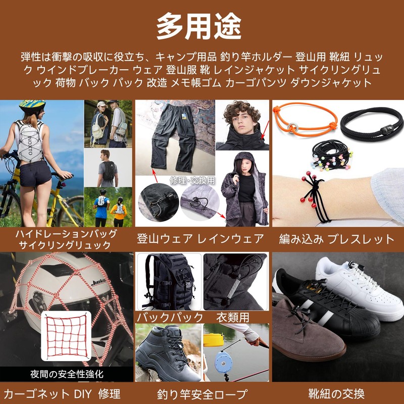 - Multi-purpose: Elasticity helps absorb impacts, camping equipment, fishing rod holder, for mountain climbing, shoelaces, backpacks, windbreakers, wear, mountain climbing, shoes, rain jackets, cycling backpack, luggage, back pack, modification, notepad, rubber, cargo pants, down jacket, cargo net, braided, bracelet, DIY