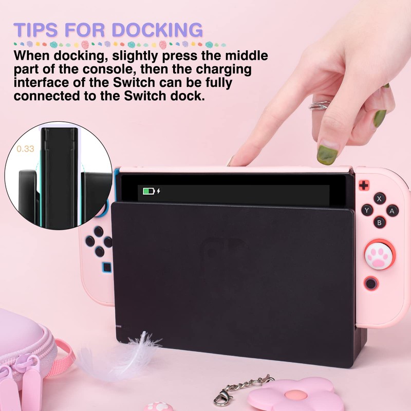 - Excellent switch package: 1 x switch travel case, 1 x carry bag hand strap, 1 x switch console dockable protective hard shell case, 2 x Joy Con hard shell case, 4 x cat paw thumb grip caps, 1 x lanyard, 1 x charm. (Note: this accessory pack does not include the switch console.)