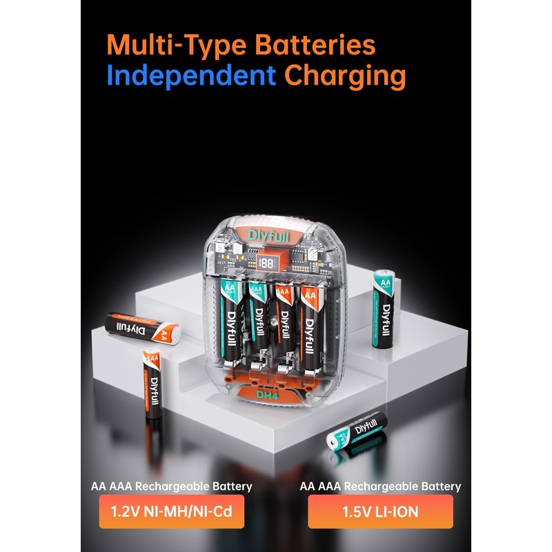 - 【Charge Any AA/AAA Fast】With independent charging slots, Universal battery charger can charge 1-4pcs 1.2V Ni-MH Ni-CD or 1.5V Li-Ion AA AAA rechargeable batteries freely. Perfect for powering game controllers, remotes, flashlights, or toys without waiting