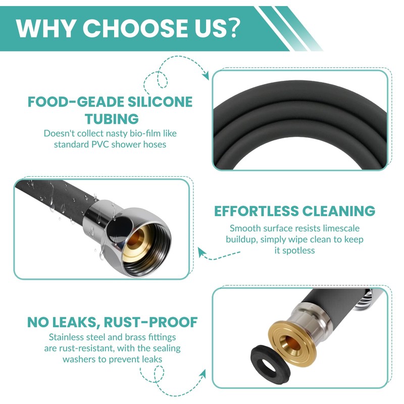 - FOOD-GRADE SILICONE: Crafted from food-grade silicone, our handheld shower hose is not prone to scale and offer exceptional softness, flexibility, durability