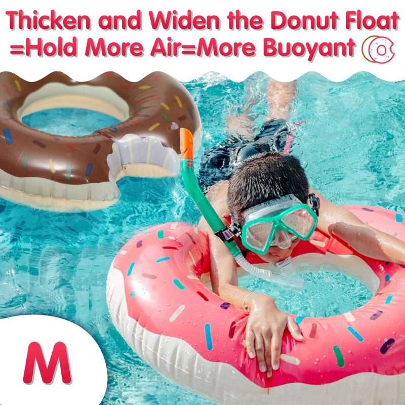 - 【Strong Buoyancy and Elasticity】We thicken and widen this donut pool inner tube, which makes it can hold more air. You will be satisfied with the donut swim float’s strong buoyancy. The strong elasticity of this pool float also helps it to hold more air. Due to this donut floatie for pool’s strong elasticity and buoyancy, it can protect you from being squeezed and tipping over. When you drift in rivers and lakes, this pool floaty can also prevent collisions with stones and float on water better.