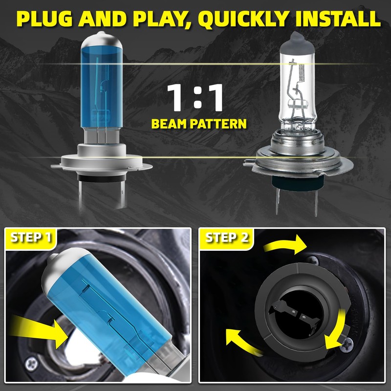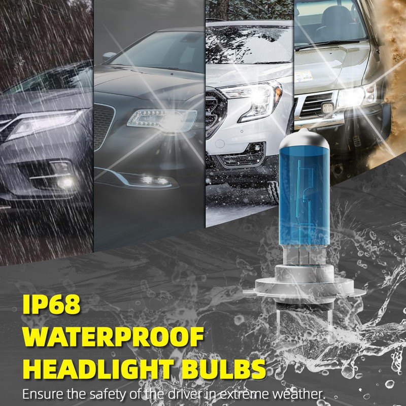 - Over 30,000 Hours Lifespan: The high low beam halogen headlight bulbs are filhalogen with Xenon gas, which helps helps to slow down the process of oxidizing the tungsten inside.With IP68 waterproof dustproof design, our halogen bulbs can last longer.