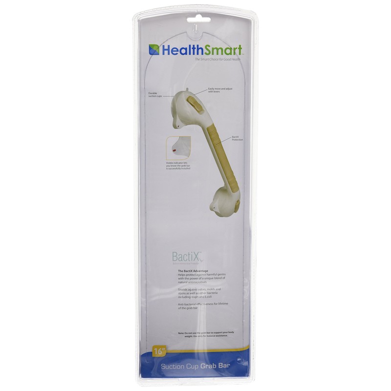 * Easily add more stability and balance in your bath or shower with this attractive grab bar. * Powerful suction cups hold the grab bar to most non-porous surfaces. No tools required! * Visual indicator lets you know if the grab bar is successfully installed. * Simply attach and reattach with the flip of the lever. Easily move and adjust with levers. * The grab bar resists the growth of harmful germs, molds odors, E.coli and staph with the power of a unique blend of natural antimicrobials, effective for the life of the product. * Check strength before each use and reattach if necessary. Do not use to support your body weight but for balance assistance. * Size: 4 ½ x 16 inches