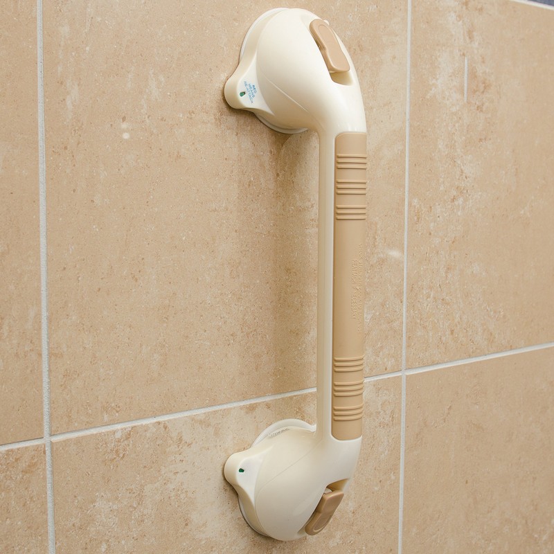 - SUCTION CUP SHOWER HANDLES, push levers down to attached to surface, push up to release. Color indicator changes from red to green to signify grab bar secure