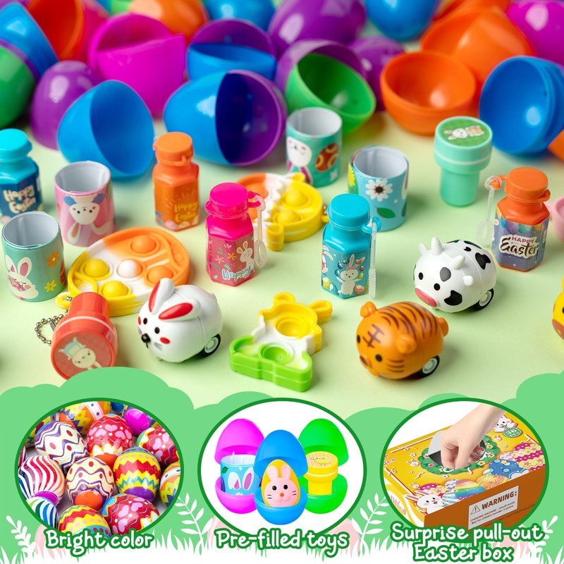 - Prefilled Easter Eggs:Forget the hassle of filling Easter eggs yourself! This convenient design makes it easy and fun to grab an egg and discover the surprises inside!