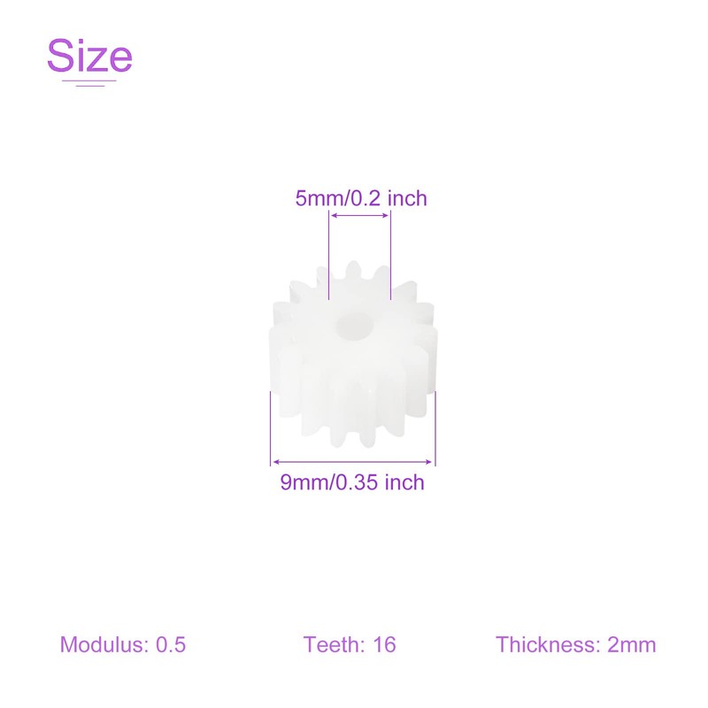 - Total Size: Model: 162A; Module: 0.5; Teeth: 16; Outer Diameter: 9 mm; Hole Diameter: 5 mm; Thickness: 2 mm