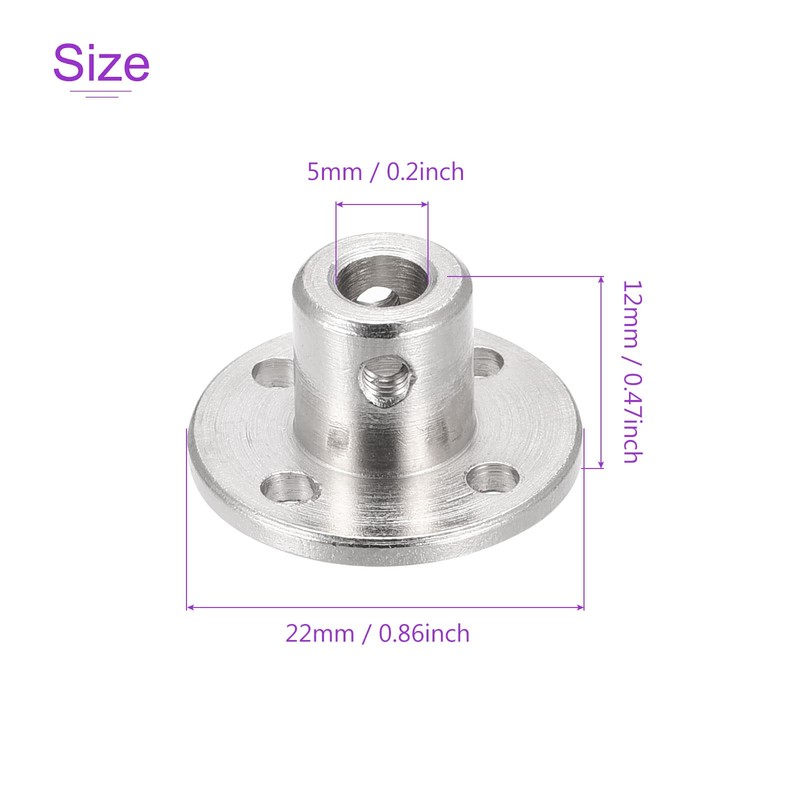 • Size: Inner Diameter: 5mm; Total Height: 12mm; Cylinder Outer Diameter: 10mm; Base Plate Diameter: 22mm; Diagonal Screw Hole Distance: 16mm; Base Plate Hole Diameter: 3mm; Material: Iron Plated; Package: 2 pcs x Rigid Flange Coupling; 1 pc x 1.5mm Mini Hex Wrench, 4 pcs x M3 Fixed Screws
