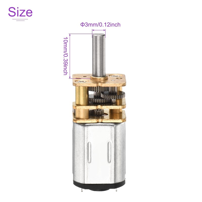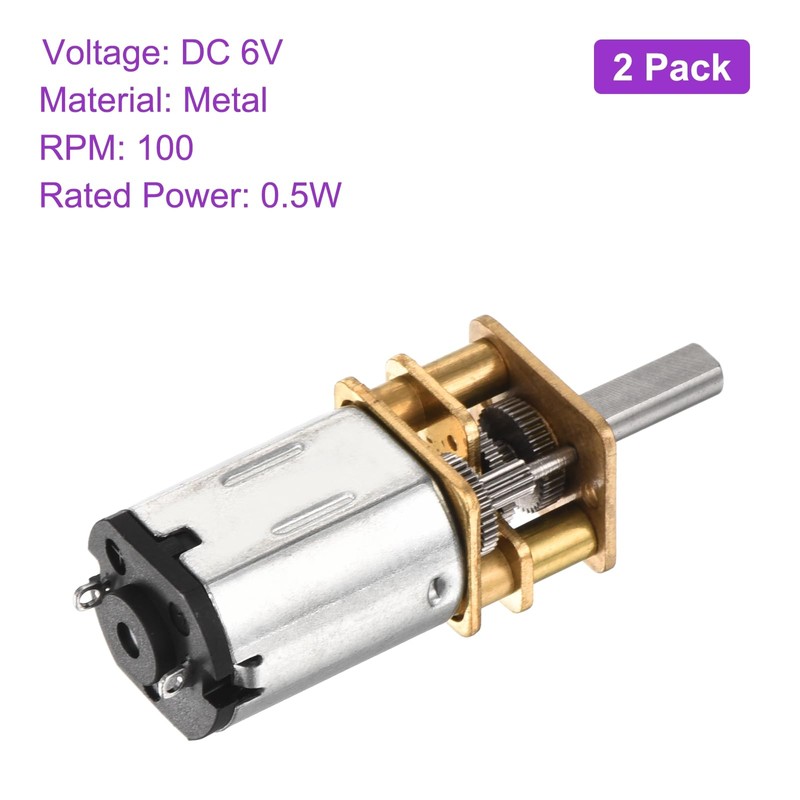 • SIZE: Voltage: DC 6V; Material: Metal; RPM: 100; Reduction Ratio: 1:100; Shaft diameter: 3mm/0.12 inch; Rated Power: 0.5w; Rated Torque: 3; Output Shaft Length: 10mm/0.39 inch; Package of:2pcs x Mini Metal Gearbox Motors