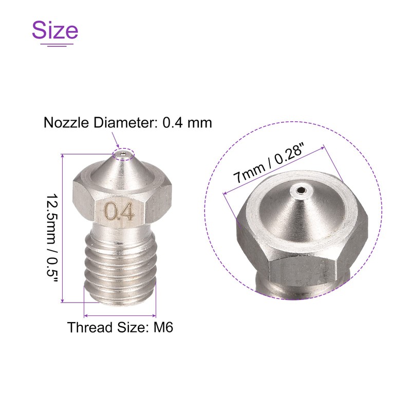 • Size: Nozzle Diameter: 0.4 mm; Fit Filament Diameter: 1.75 mm; Overall Size: 12.5 x 7 mm (L*D); Screw Size: M6