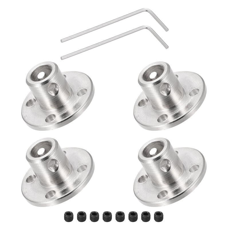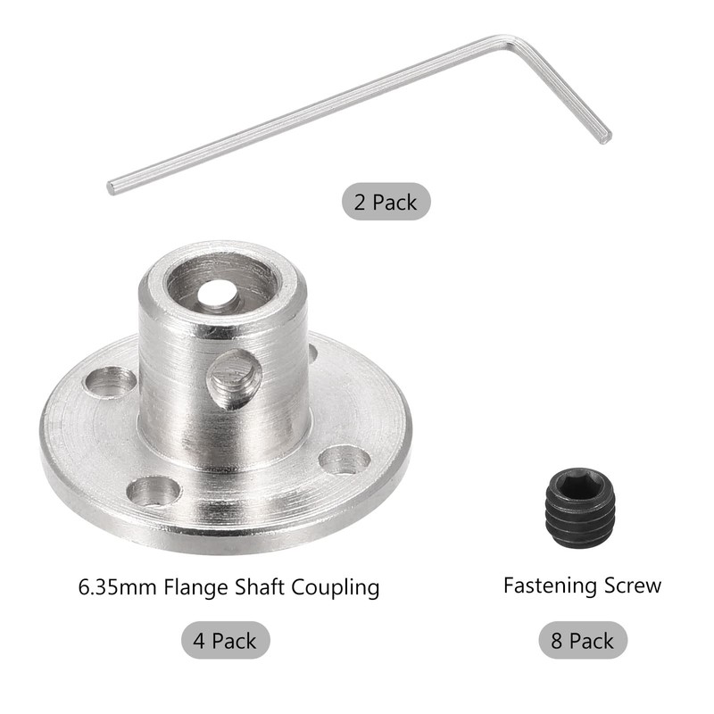 - Size: Inner Diameter: 6.35mm; Total Height: 12mm; Cylinder Outer Diameter: 10mm; Base Plate Diameter: 22mm; Diagonal Screw Hole Distance: 16mm; Base Plate Hole Diameter: 3mm; Material: Iron Plated; Package: 4 pcs x Rigid Flange Coupling, 2 pcs x 1.5 mm Mini Hex Wrench, 8 pcs x M3 Fixed Screws