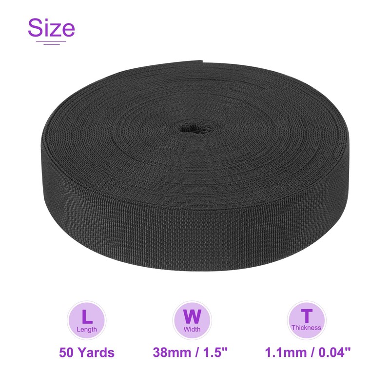 - SIZE: Length: 50 Yards; Width: 25mm / 1 inch; Thickness: 1.1mm / 0.04 inch; Color: Black; 1 Roll of Nylon Webbing Strap