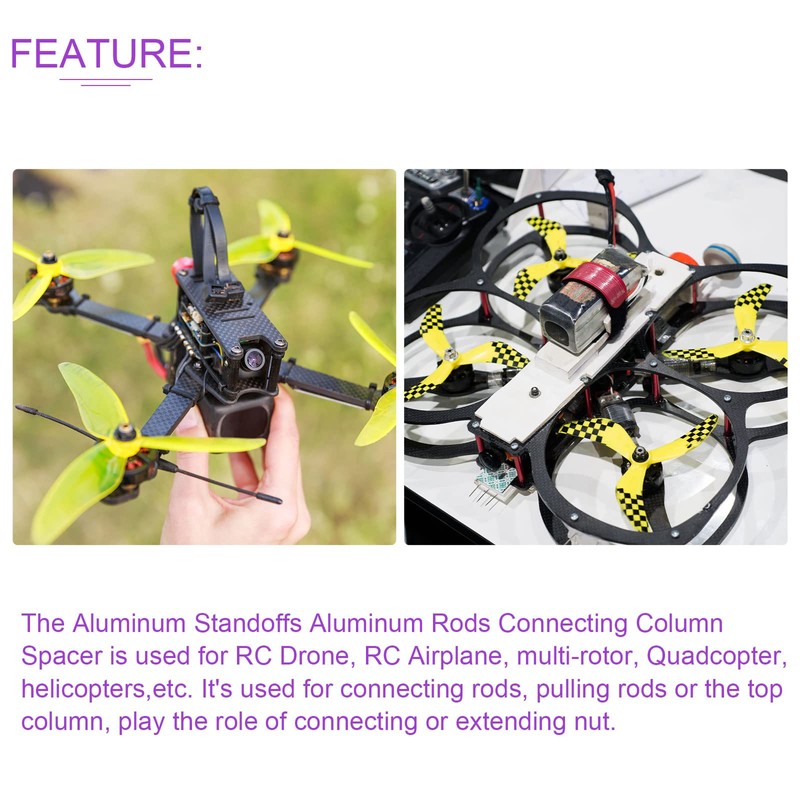 - APPLICATION: The Aluminum Standoffs Aluminum Rods Connecting Column Spacer is used for RC Drone, RC Airplane, multi-rotor, Quadcopter, helicopters, etc. Fit for a DIY model, RC Quadcopter/FPV Drone fixing and connecting.