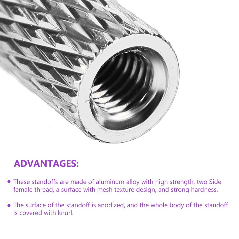 - FEATURE: 1. These standoffs are made of aluminum alloy with high strength, two Side female thread, a surface with mesh texture design, and strong hardness. The surface of the standoff is anodized, and the whole body of the standoff is covered with knurl.