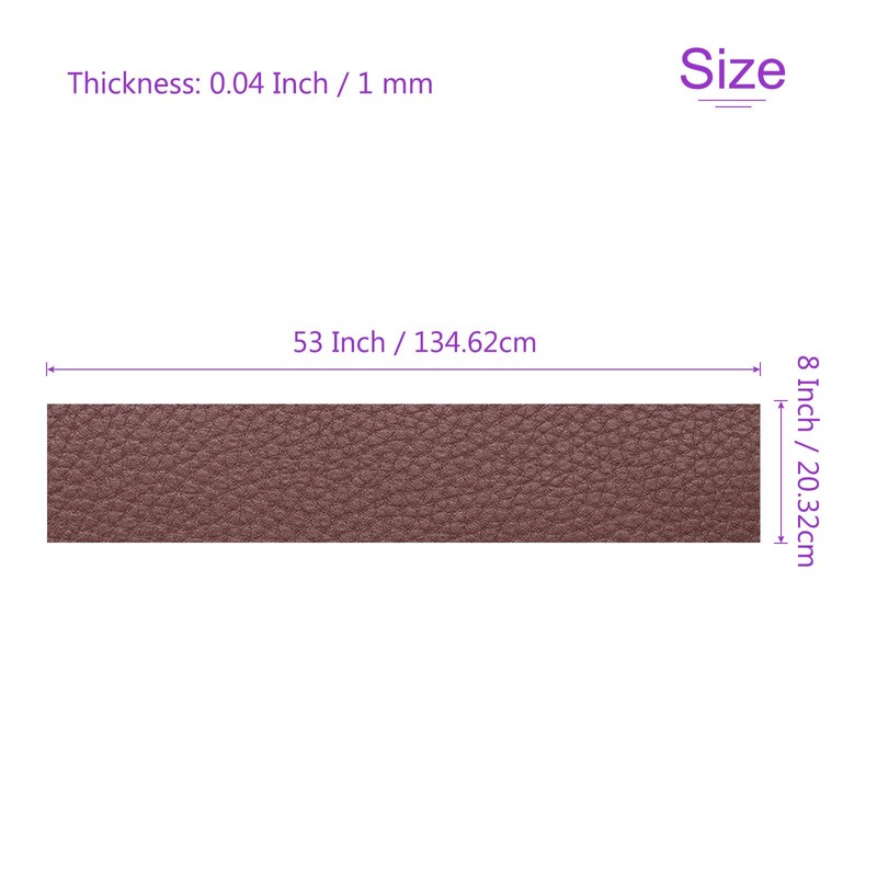 • Material: PU Leather; Pattern: Soft Grain; Leather Color: brown; Backing Color: Yellow; Backing Material: Cotton Size:134.62cm x 20.32cm / 53 Inch x 8 Inch; Thickness: 1 mm / 0.04 Inch; In the package of: 1 Pcs x Faux Leather Sheet
