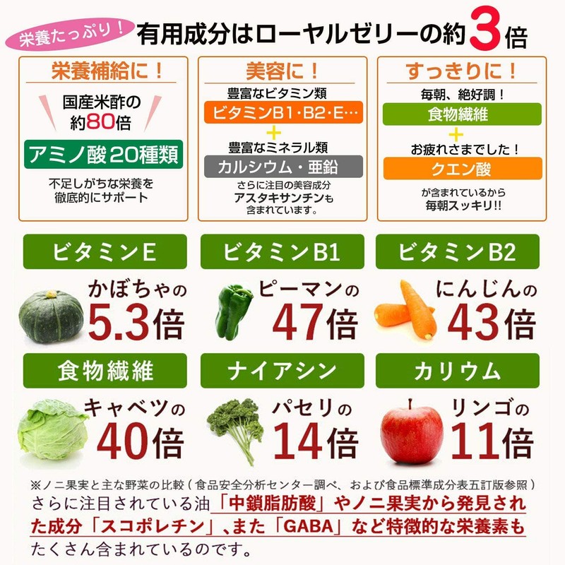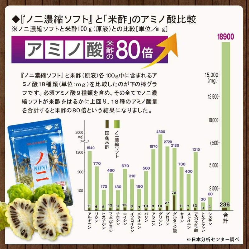 - ▼嬉しい アミノ酸配合:ノニのアミノ酸の含有量は米酢の約80倍とたっぷりです。ノニのアミノ酸は、細胞や筋肉を構成するたんぱく質の素であり、とても重要な栄養素です。肉にも多く含まれますが、油でカロリー摂取が多くなってしまいます。ノニの植物性アミノ酸ならば、そのような心配はいりません。
