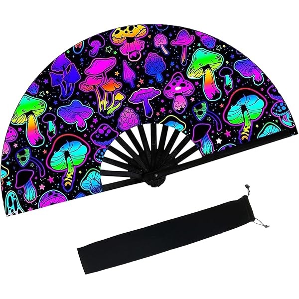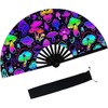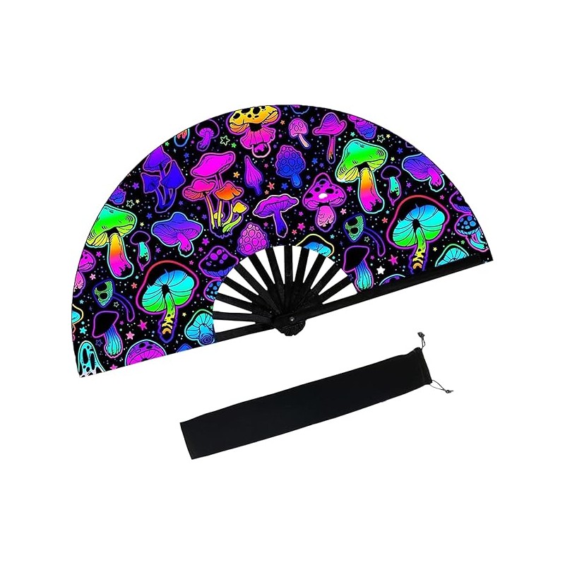 dmjuncong Large Folding Hand Rave Fan,Clack Handheld with Fan Bag,for Line Dancing,Music Festivals,Carnival,Rainbow Outfits,Disco,Neon, Glow Party Decorations Supplies.Mushrooms