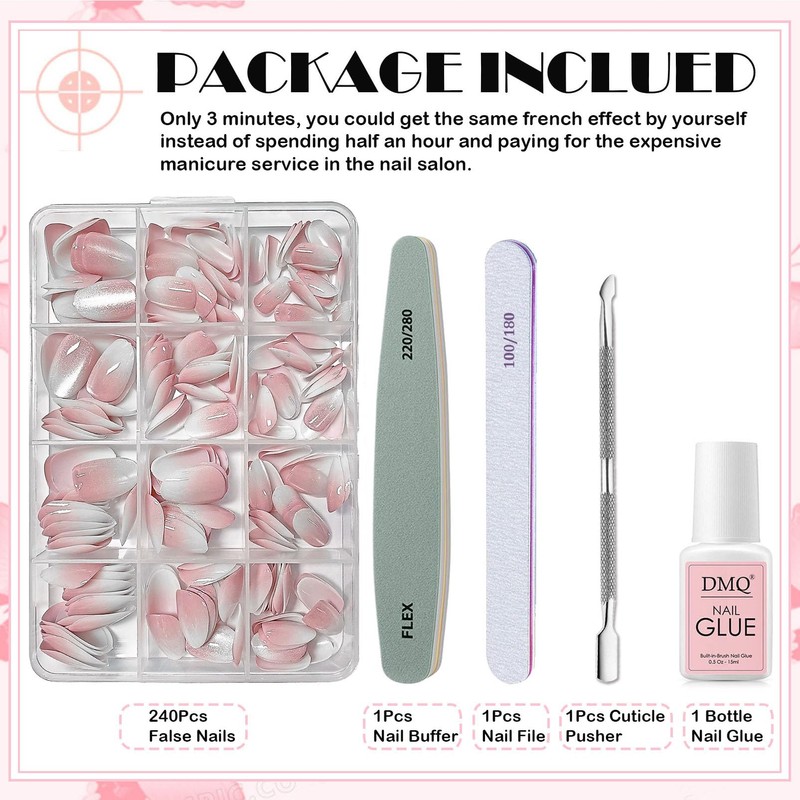 - 【Cat Eye Obmre False Nails Set】- DMQ False Nails Set includes 240pcs pink gradient cat eye fake nails, Various nail tools as 1pcs 15ml nail glue, 1pcs stainless steels cuticle pusher,1pcs double-sided nail file and 1pcs nail buffer. Natural gradient pink with sparkle cat eye design, elegant and never fade, can make nails more delicate, and can also cover broken nails and protect nails.