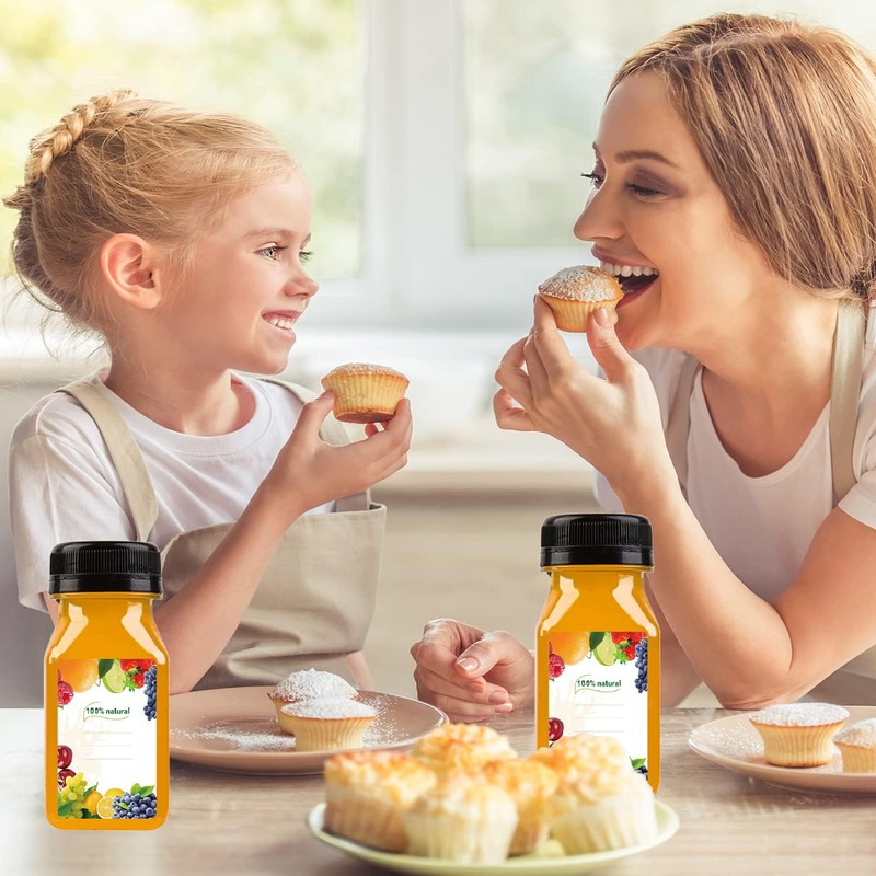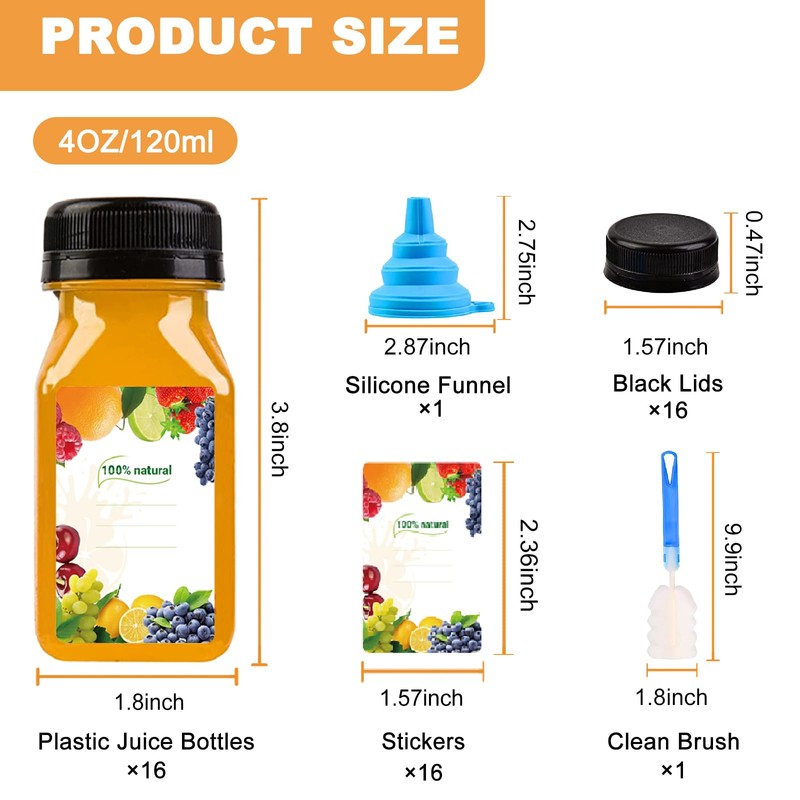 - Perfect Set: Contains 16 pcs 4oz plastic juice bottles with 16 black tamper-evident caps, with a cleaning brush, funnel, and 16 labels, the labels You can mark each drink to make it easier to distinguish.