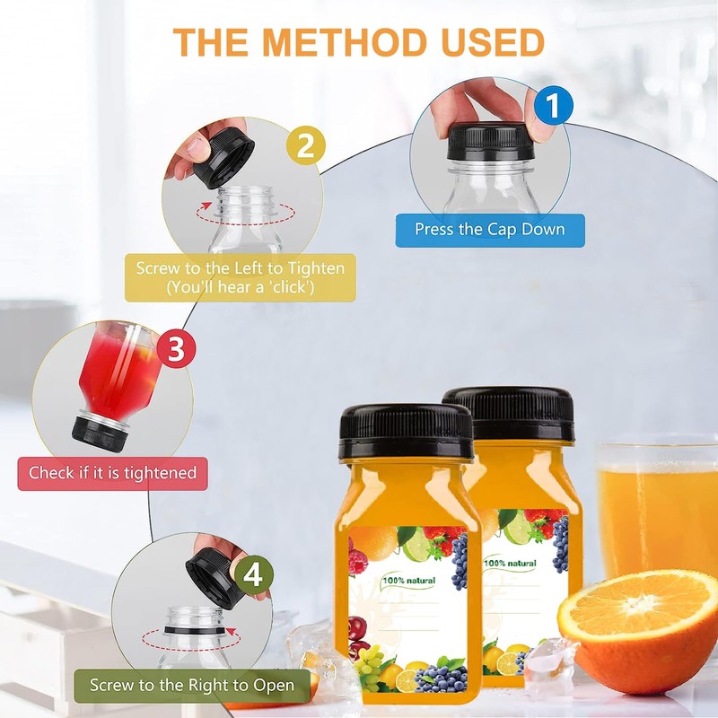 - Quality Materials: Made of thick food-grade PET material, BPA-free, safe and odorless, anti-drop, and not easy to break. The plastic juice bottle is easy to clean and reuse, but not suitable for hot liquids.