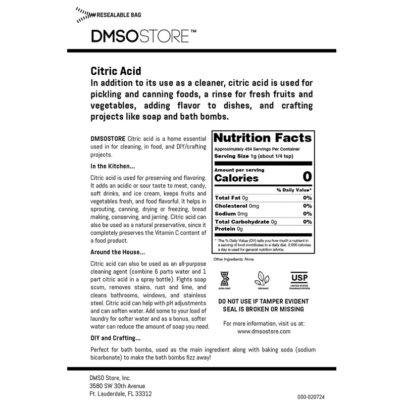 - DMSOSTORE'S 100% Pure Citric Acid comes packed in a heavy reseable stand up foli pouch that keeps light and oxidation from affecting the product quality and freshness allowing for long safe storage.