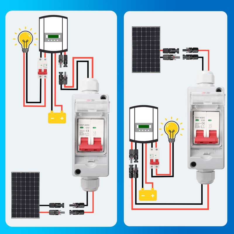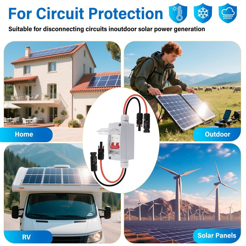 - 【Protections】Isolation, short-circuit, and overload safeguards with C-curve trip characteristics and thermal-magnetic trip mechanism. Compatible with 12V–1000V DC/AC systems.