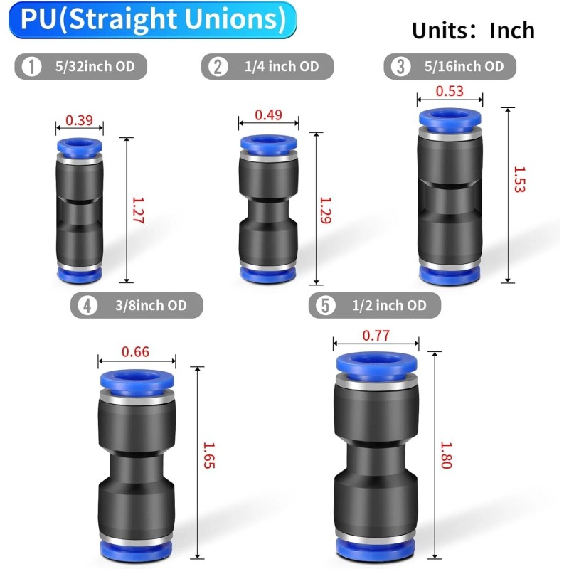 - Multi-Size Compatibility: Includes 5 sizes (OD 1/2, 5/32, 3/8, 5/16, 1/4"), perfect for various pneumatic air tubing systems.