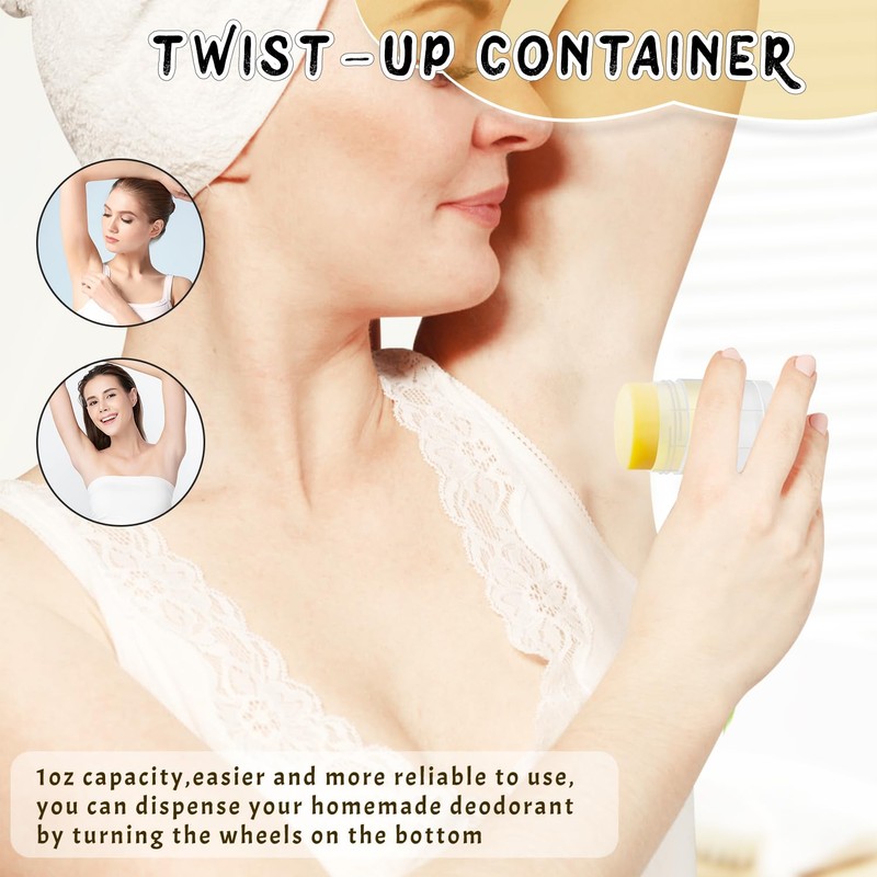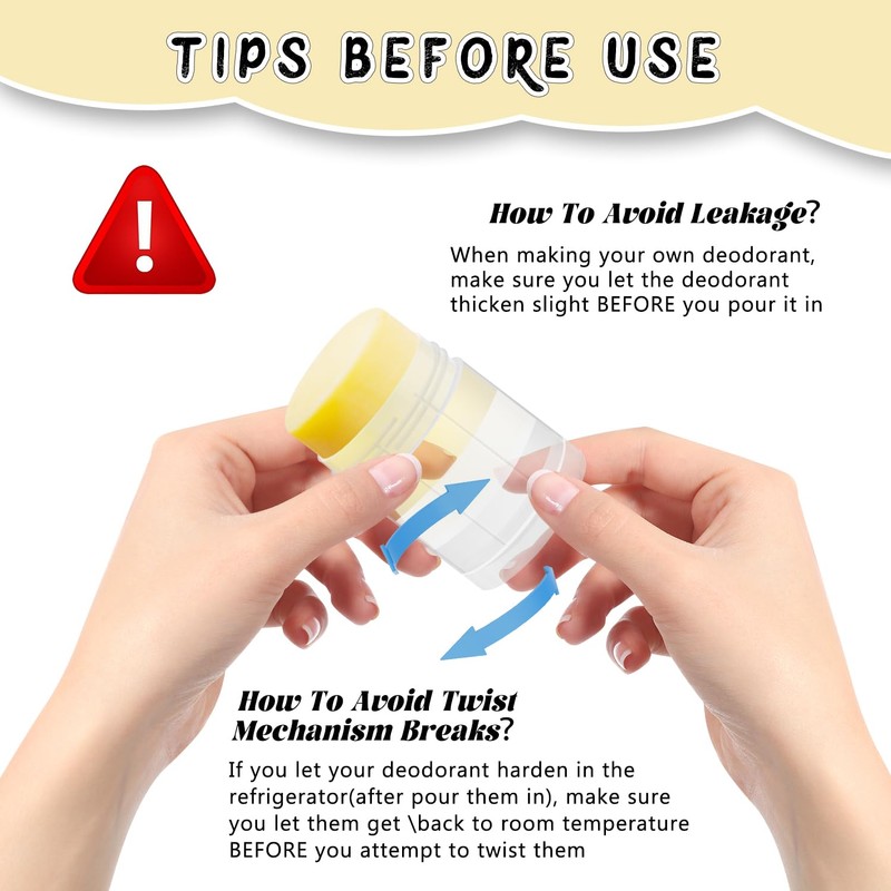 - 【Easy To Use】Pour your deodorant mix into the tube, let it cool/solidify;then turned the twist dial,the balm will slowly raise upwards to the desired level.applied to the necessary areas of the body, smoothly and easily.