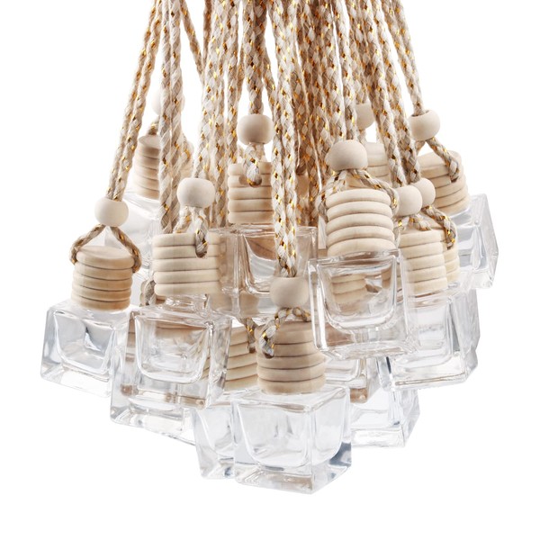 DMuuuDM 20 Pcs Hanging Car Air Freshener Diffuser,Empty Refillable Clear Square Glass Essential Oil Hanging Decor Aromatherapy Fragrance Pendant Vials with Wooden Caps & Hanging String