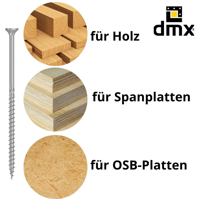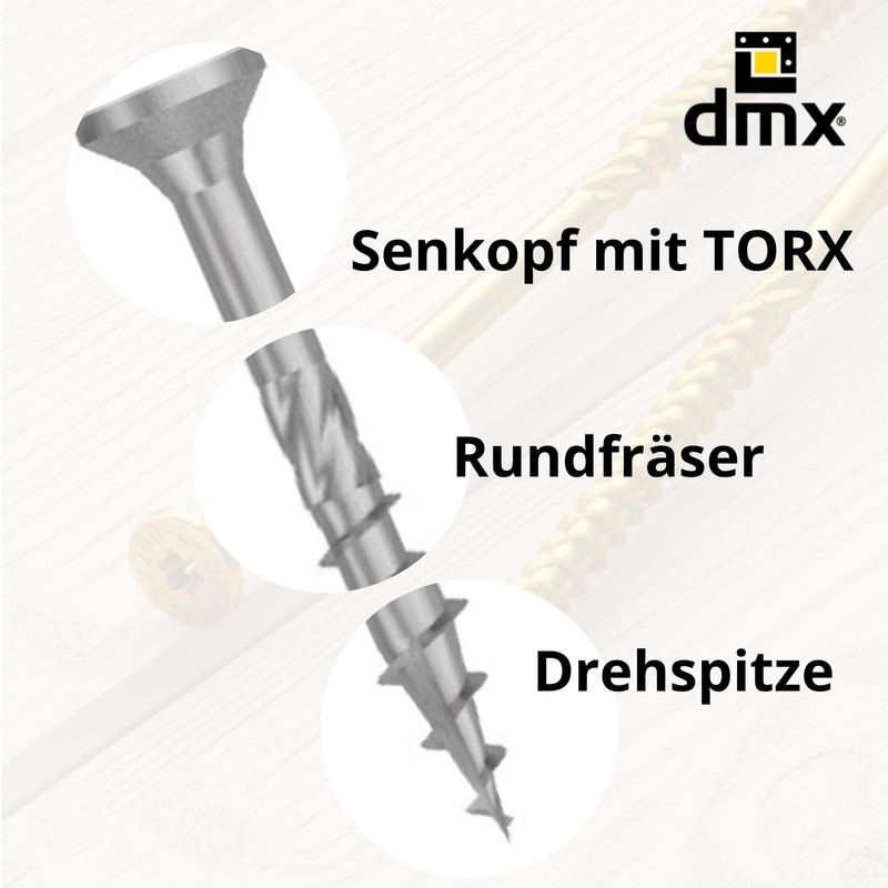 - Many customers trust DMX Torx screw set, screws wood and the comprehensive screw range for professional and private projects. DMX guarantees high quality, reliability and safety with every application.