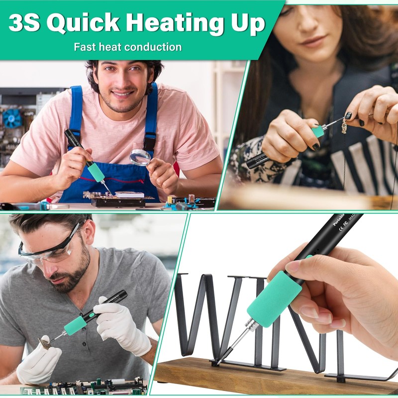 - Versatile Kit: 1×Cordless soldering iron, 3×soldering iron heads, 1×Case, 1×solder wire, 1×type-c charging cable, includes essential accessories, making it a comprehensive solution for all your soldering needs. Widely used in circuit board soldering, electrical repair, jewelry and metal headwear production, computer and DIY
