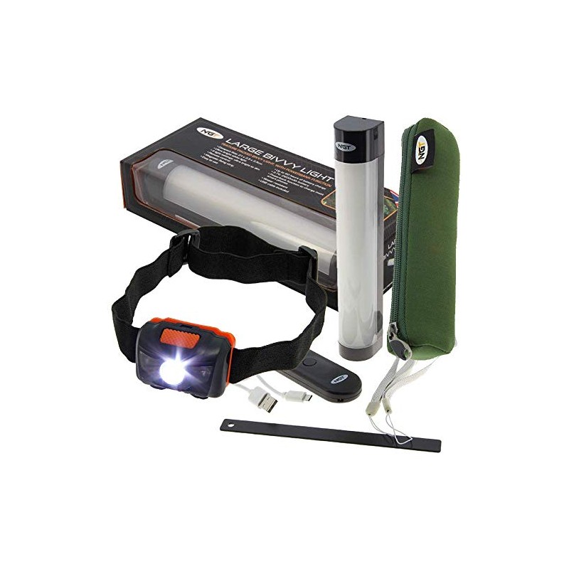 Great fishing lighting set! Includes a large bivvy light, with neoprene storage case as well as a free headtorch for nighttime excursions out of your bivvy! NOW WITH RED & WHITE LIGHT.... A feature packed bivvy light, with power bank function. Features include: Compact size: 21 x 3.5 x 3.5cm 4 light settings: Now also including red 'night light.' Remote control (requires 1 x LRV08 battery not included) Magnetic fixing strip Up to 60 hours of battery charge (to mobile phones) 3.7V, 2600mAh lithium ion battery Water resistant USB charging cable included Brand: NGT A stylish headlight featuring; 100 Lumen white LED light with high / low beam function Twin red LED light with medium beam and flashing beam function Adjustable headstrap Tilt funtion Water resistant Lightweight 100,000 Hour battery life Requires 3 x AAA batteries (not included) Brand: NGT A handy neoprene case for the NGT large bivvy light. Brand: NGT