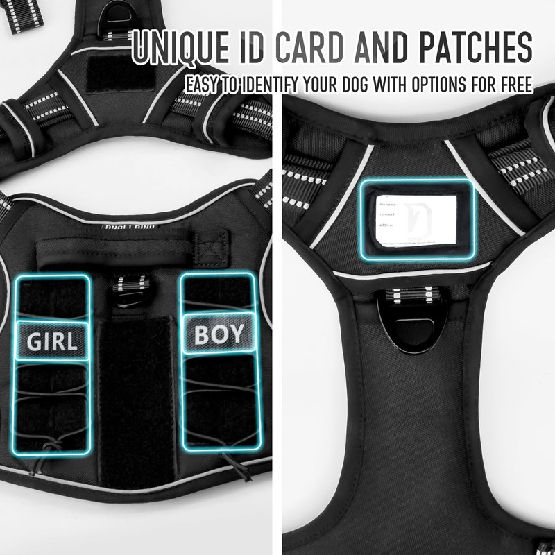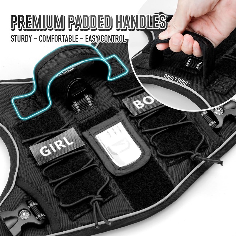 - MOLLE System Versatility: Equipped with Molle System on three sides and elastic strings, our harness offers customization. "BOY" or "GIRL" badges and Velcro ID tags allow personalization. The spacious Velcro plate lets you add your favorite badges, making it perfect for service, hunting, and outdoor adventures. You can even attach accessories like bowls, water bottles, and toys (accessories not included).
