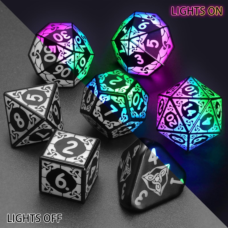 • Complete DND Dice Set Versatility: Full polyhedral set: D4, D6, D8, D10×2, D12, D20. Works for D and D, RPGs, or any tabletop adventure. Charge hack: Place highest number up when docking!