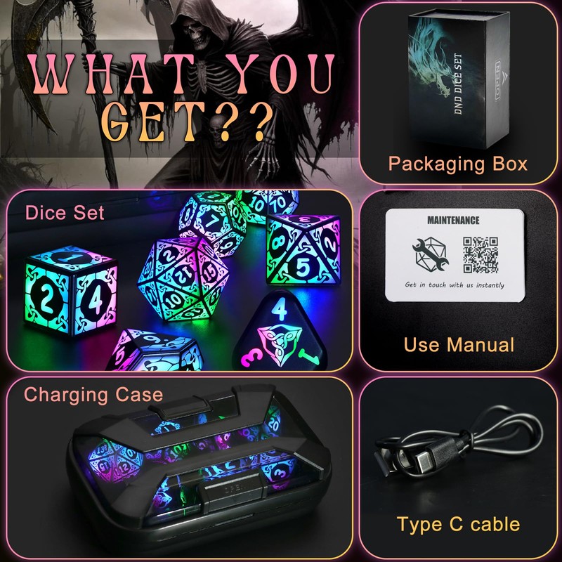 • DM's Ultimate Gifts Unleashed : Delivered in spellbook-themed box with charging case + cable. Covers all 7 polyhedral dice. The hit gifts for Christmas, Valentine's, or "I survived the dragon" celebrations!