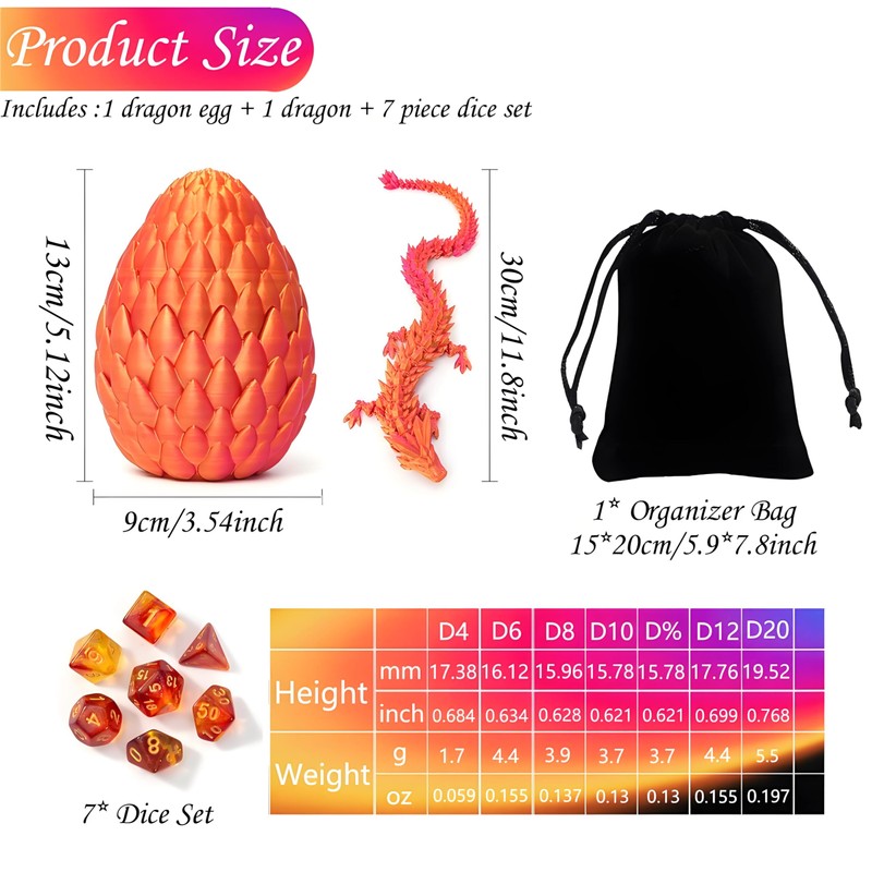 - 🌟 High-Quality Material: Made from durable, eco-friendly materials, the dragon egg and dice feature a smooth finish and vibrant colors, ensuring they withstand countless adventures without losing their charm.